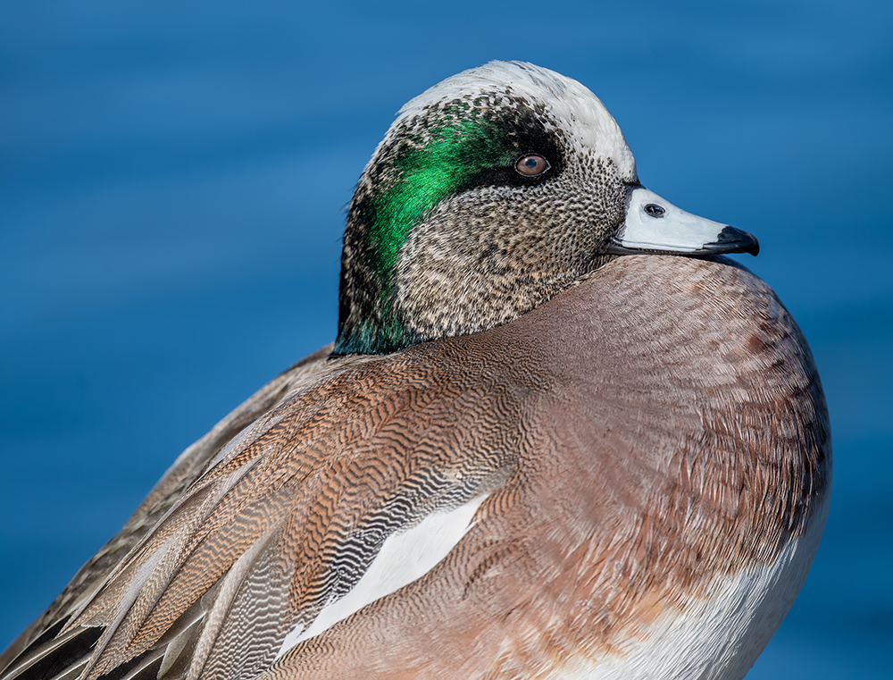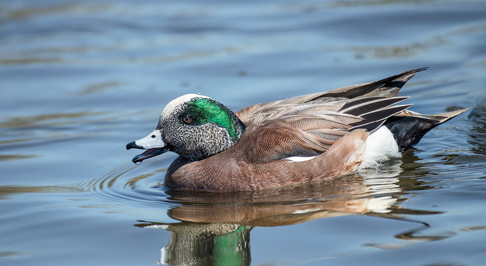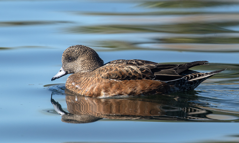American Wigeon is a medium-sized dabbling duck (18–20 in long) that is a regular winter visitor and spring–fall migrant in Arizona. Adult males in breeding plumage sport a white crown and green eye-stripe, while females are overall mottled brown with a gray bill tipped in black.