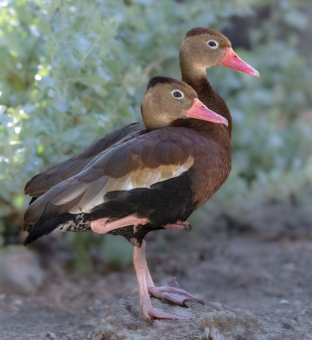 Black-bellied Whistling-Ducks are medium-sized waterfowl distinguished by long pink legs and bill, chestnut head and neck, white eye-ring, warm brown upperparts and striking black belly. In Arizona, they occur primarily in the southeastern corner of the state—most notably at Whitewater Draw Wildlife Area (Cochise County), along the San Pedro River near Benson, and in the Sulphur Springs Valley—where they were first documented nesting in 1990 and have since become a locally regular summer resident.