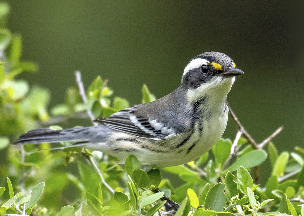 The Black-throated Gray Warbler is a black and white warbler that has a tiny spot of yellow just above and in front of the eye. The male's black throat and gray back give it its name, but its bold black-and-white striped face is eye catching. Females, pictured above, do not have the black throat.
