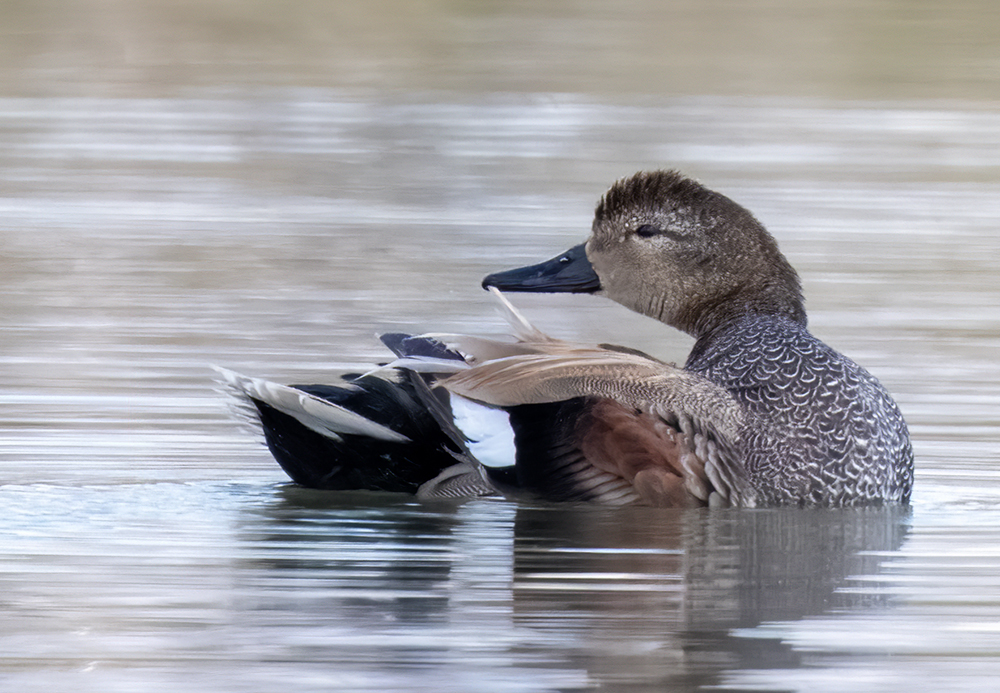 The Gadwall is a medium-sized dabbling duck characterized by a quietly patterned gray body and, in the male, a distinctive black rump patch. In Arizona, Gadwalls are primarily winter visitors, arriving as early as October and remaining through March or April, with peak concentrations at low-elevation reservoirs, managed wetlands (such as Cienega Creek and the ponds around Tucson), and along the lower Colorado River. Although commonplace in winter—often seen in mixed flocks with Mallards and Pintails—breeding is rare in the state; a handful of nesting records exist along the Colorado River near Yuma and at some higher-elevation reservoirs. Gadwalls feed by tipping forward (“dabbling”) to graze on aquatic vegetation and small invertebrates, and their unobtrusive plumage and mellow quack make them a familiar, if easily overlooked, component of Arizona’s winter waterfowl assemblage.