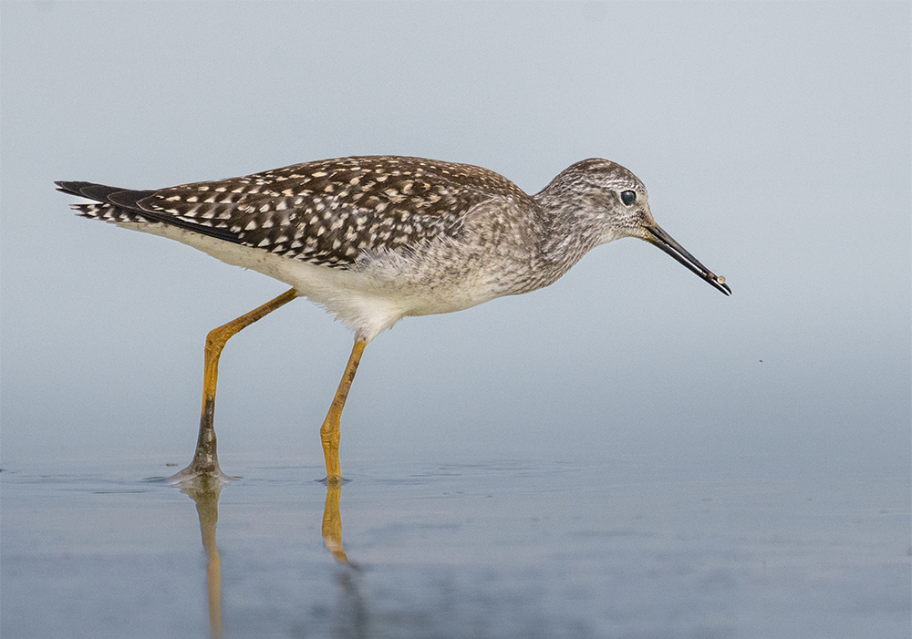 In Arizona, Greater Yellowlegs are regular spring and fall migrants, most often seen probing the shallows of marshes, lake margins and flooded agricultural fields. Peak passage occurs April–May and again August–October. A few linger through winter along the lower Colorado River and in southern wetland refuges such as the Willcox Playa and Whitewater Draw. They forage by wading in shallow water—stirring mud with their long bills to expose aquatic invertebrates, small fish and tadpoles—and give a distinctive series of sharp, rolling “tew-tew-tew” calls while on the wing or when flushed.