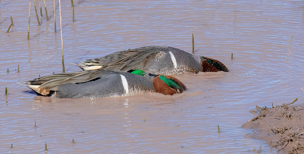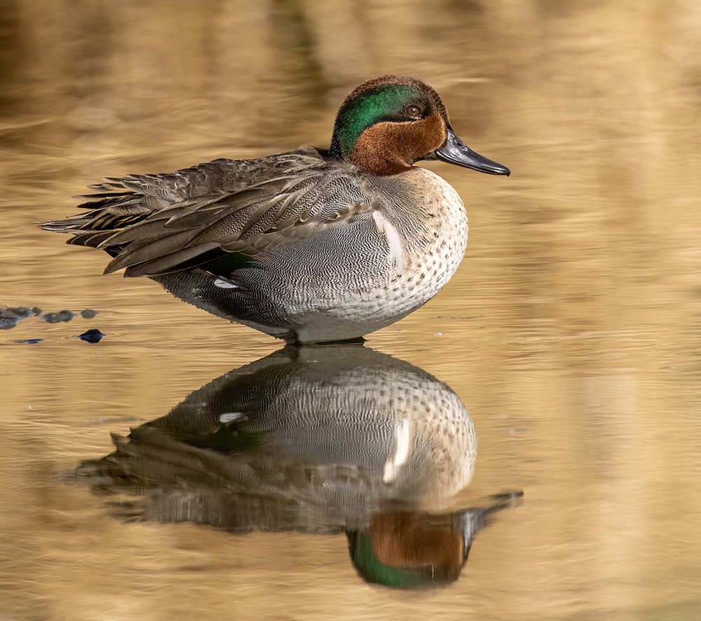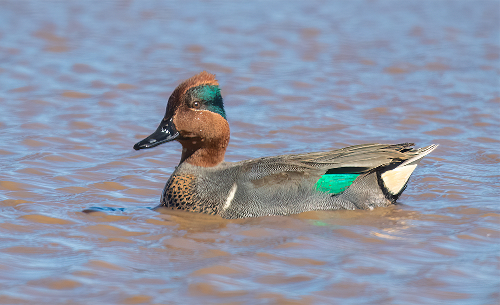 The Green-winged Teal is North America’s smallest dabbling duck and one of Arizona’s most abundant wintering waterfowl. Adults arrive as early as late September and remain through March, congregating in shallow marshes, irrigation canals, rice fields and river backwaters—particularly along the Lower Colorado River, Bill Williams Delta, Cienega Creek and urban ponds. Their diet consists mainly of aquatic seeds (e.g., pondweed, sedges) supplemented by small mollusks and insects, which they “dabble” from the water’s surface. The drake is unmistakable with its chestnut head, iridescent green eye-patch and narrow white flank stripe; females are mottled brown with a hint of green on the speculum. Though primarily a migrant and winter visitor, a handful of summer records from high-elevation marshes on the Mogollon Rim suggest occasional breeding in Arizona. Their large winter flocks underscore the importance of the state’s wetlands for conserving migratory waterfowl.
