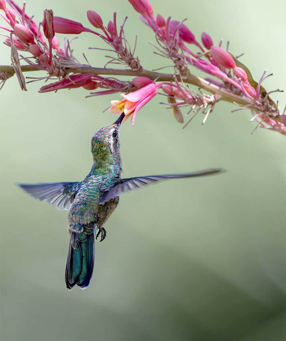 Broad-billed Hummingbird is a summer-breeding visitor in southeastern Arizona, most abundant along riparian corridors and canyon bottoms—places like Madera Canyon, Sonoita Creek, and the Santa Cruz River—where it occurs from roughly March through September. The male’s vivid emerald-green body, glittering sapphire-blue throat, and broad red bill with a black tip make it unmistakable; females and juveniles are paler, with whitish underparts and variable throat spotting. This species feeds on nectar from native flowers (e.g., desert honeysuckle, Penstemon) and backyard feeders, then migrates south into Mexico for the winter, although with a plentiful source of nectar, some stay all year round.