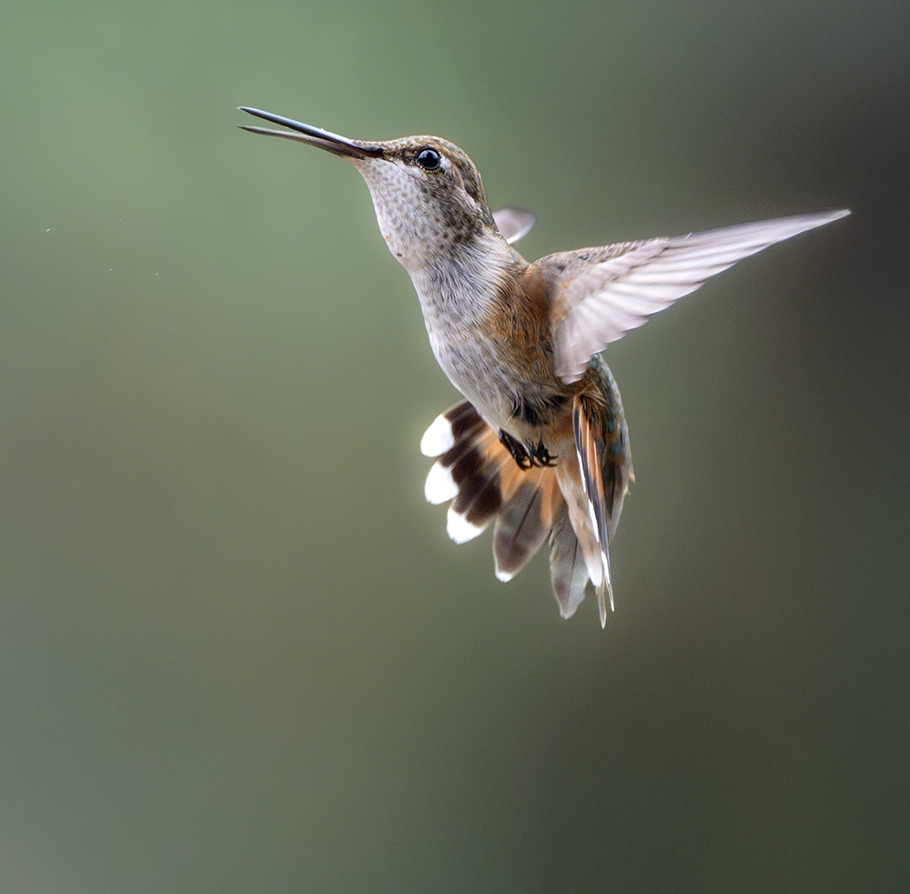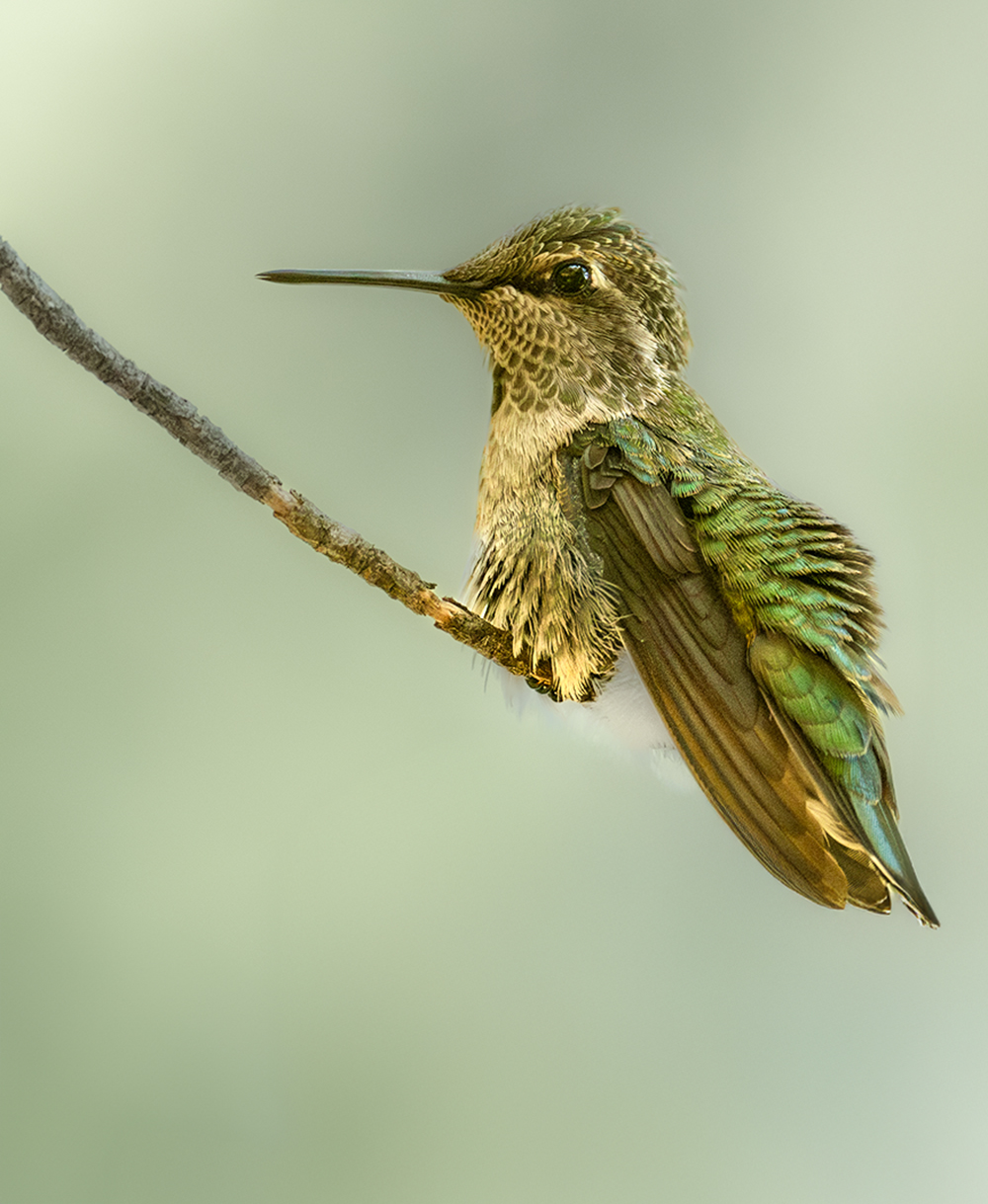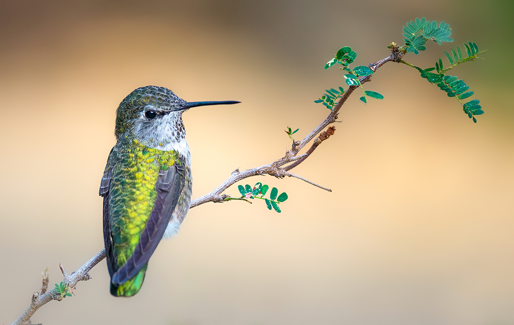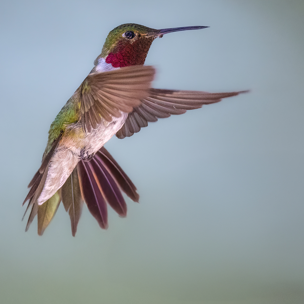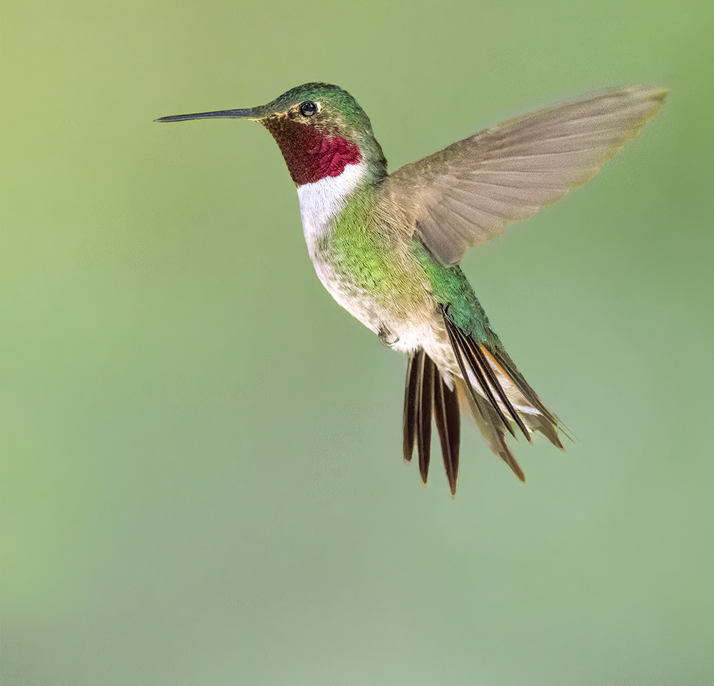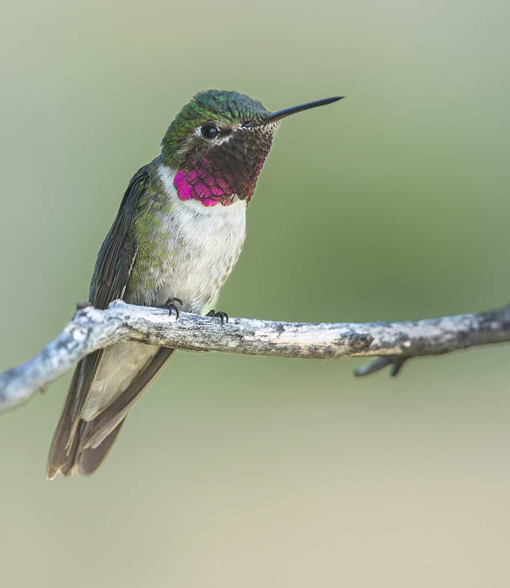 The Broad-tailed Hummingbird is a medium-sized, rose-throated species that nests in Arizona’s high-elevation meadows and forest edges, typically between 5,000 and 10,000 feet. Arriving in late April or early May, males announce their presence with a loud “churr” and an acrobatic dive display, flashing green upperparts and a rose-pink gorget; females build tiny cup nests lined with plant down and spider webs, often concealed on horizontal branches of conifers or shrubs. They forage on a variety of montane wildflowers—such as columbine and penstemon—and readily visit backyard feeders, departing by late July or August to spend winters in Mexico’s pine-oak woodlands.