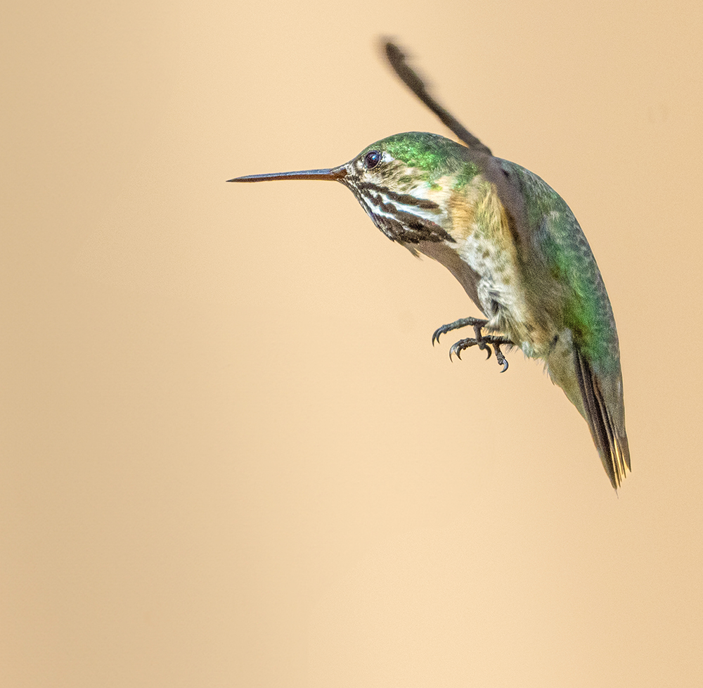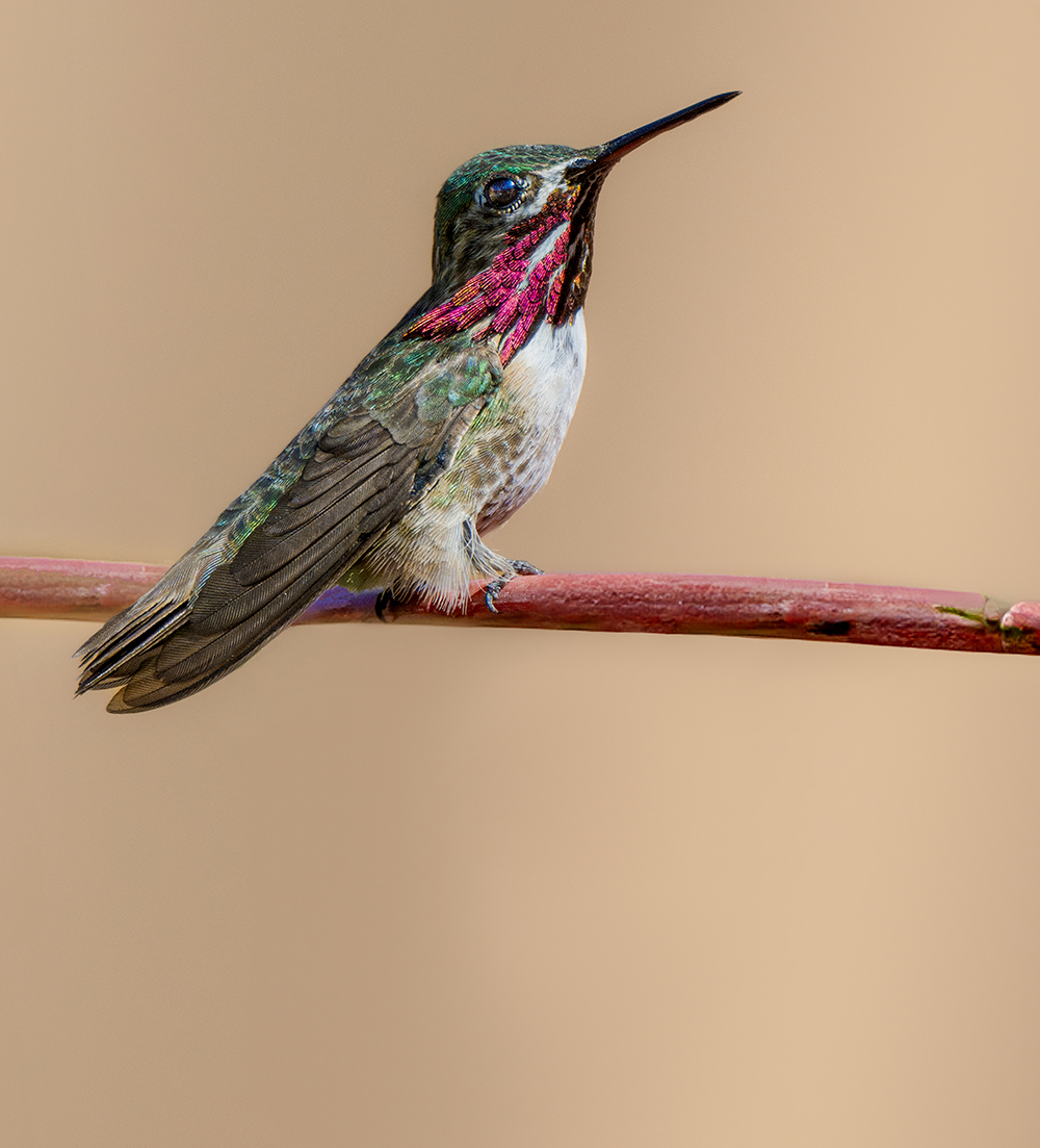 The Calliope Hummingbird is the tiniest breeding bird in North America, measuring just 3–3.5 inches long. In Arizona, it’s a summer resident—arriving in April and departing by August—favoring montane oak woodlands, pine–fir forests and riparian canyons at elevations between about 4,000 and 8,500 feet. It’s most often encountered in southeastern Arizona’s Sky Islands, where it darts among small wildflowers and backyard feeders, with the iridescent magenta stripes on its throat patch flashing in the sun. A long-distance migrant, the Calliope winters in Mexico before returning north each spring.