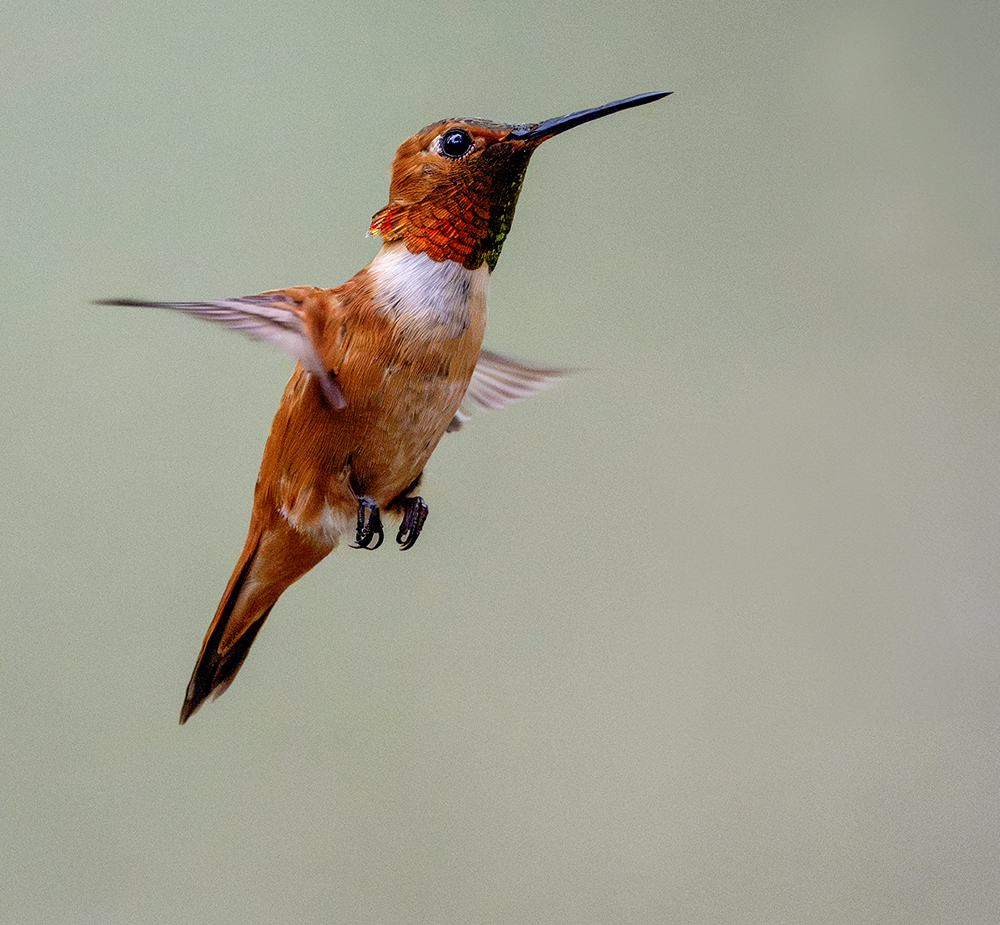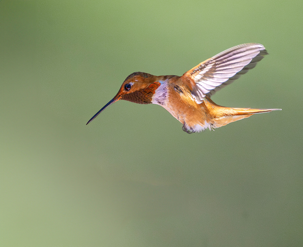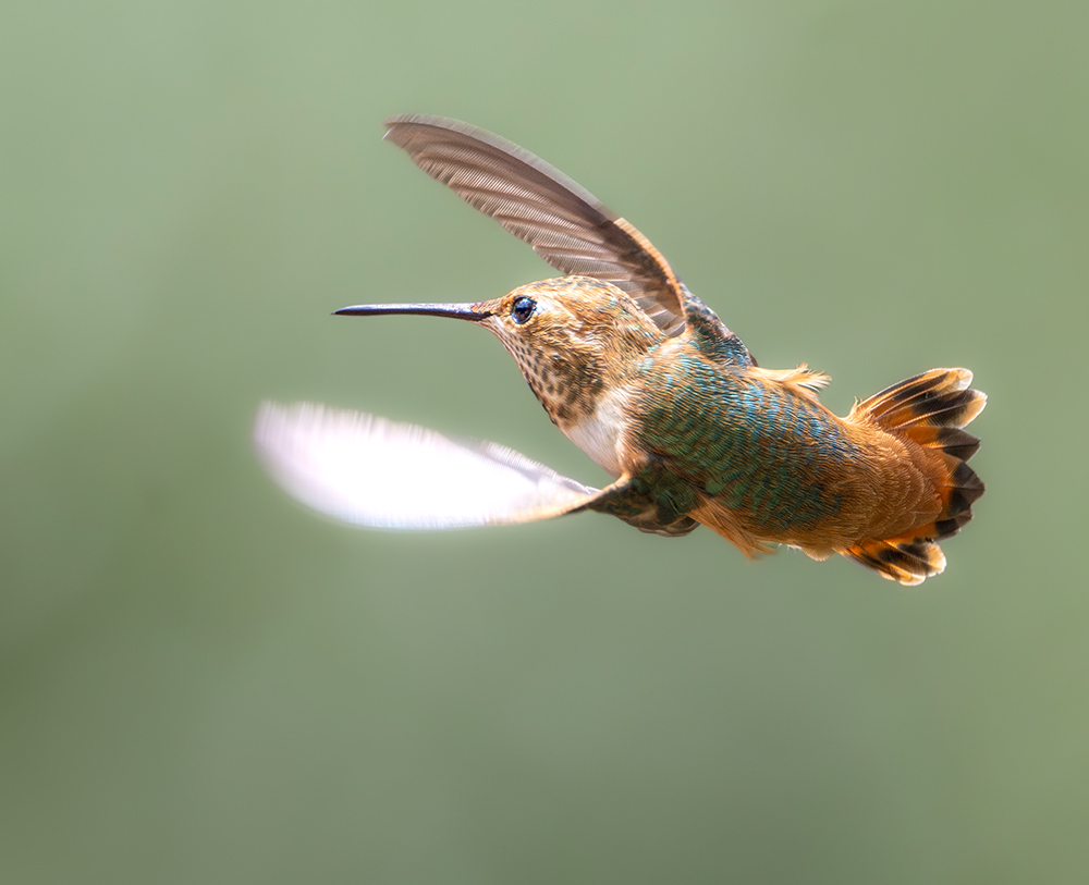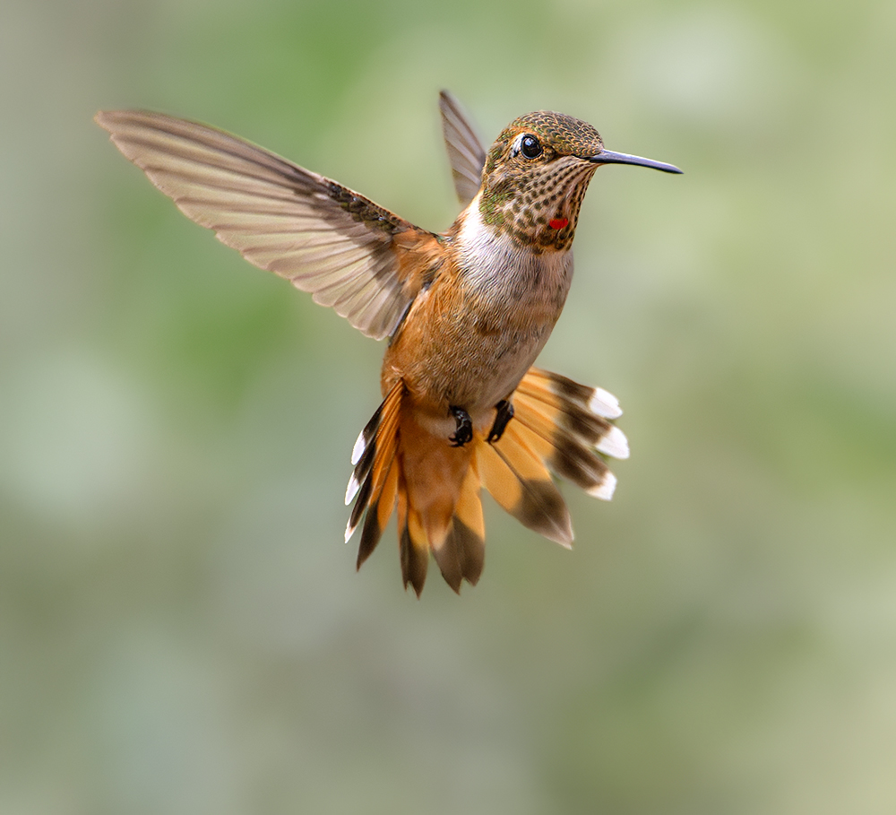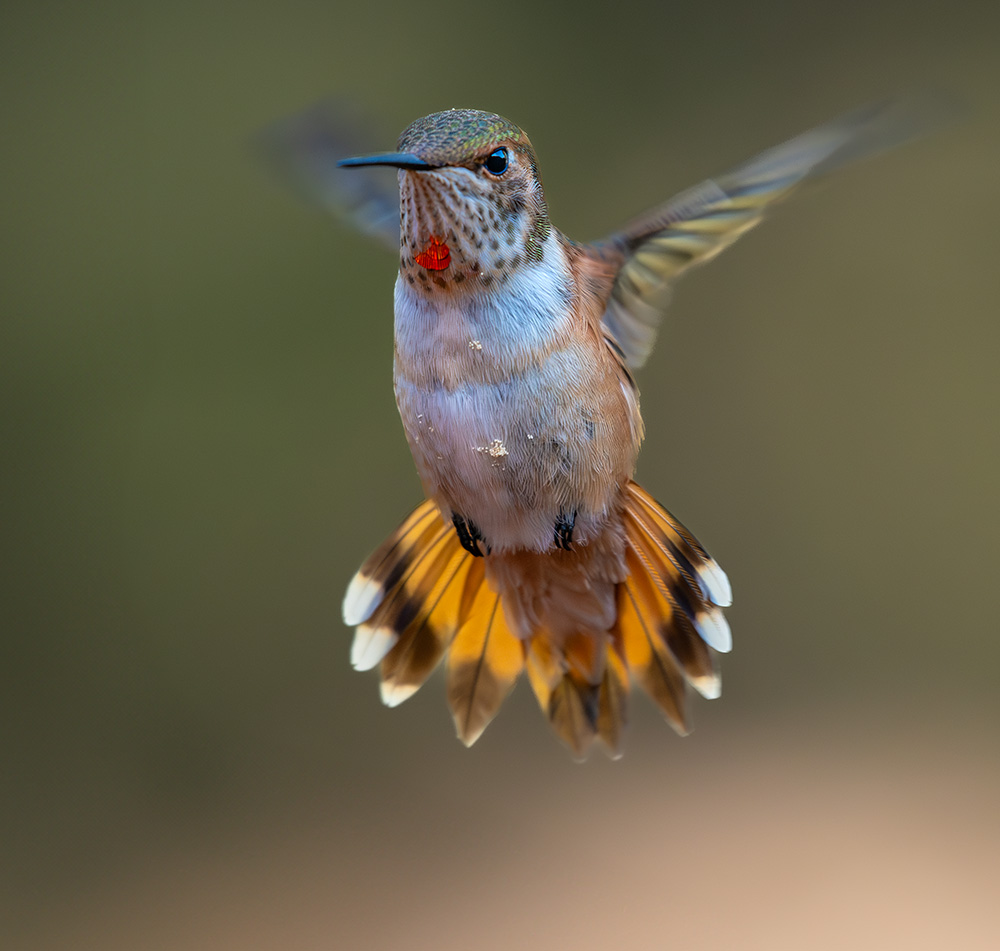 The Rufous Hummingbird ( Selasphorus rufus ) is a small, fiery-orange migratory species that passes through Arizona each spring and fall, often stopping at feeders and flowering desert plants in riparian canyons and mountain foothills. Though it breeds mainly in the Pacific Northwest’s coniferous forests, a few individuals occasionally overwinter in southern Arizona’s milder lowlands if nectar sources remain available. Renowned for its feisty, territorial behavior, the Rufous Hummingbird is one of the first migrants to arrive (typically late March) and one of the last to depart (often into November).