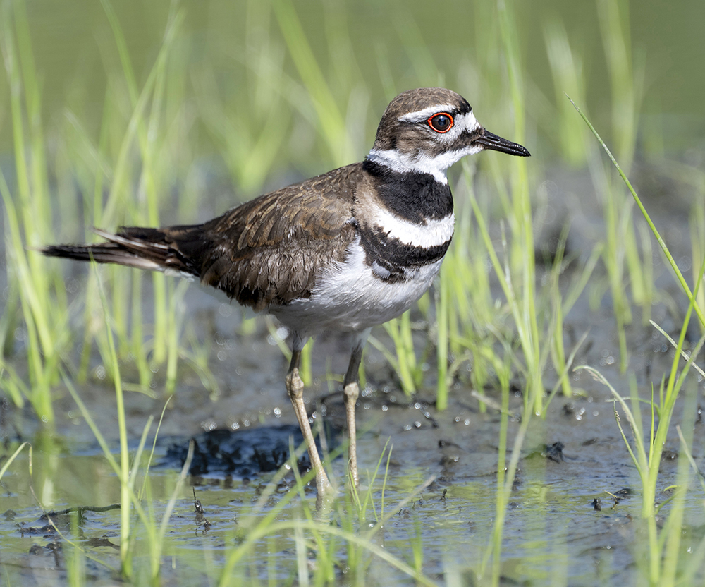 The Killdeer is a medium-sized plover, 9.4–11 inches long with a wingspan of 18.5–22 inches. Adults have warm brown upperparts, a white belly, two bold black breast bands and a white forehead, and stand on long, pinkish legs. Their loud, ringing “kill-dee” call makes them unmistakable in flight or when foraging.