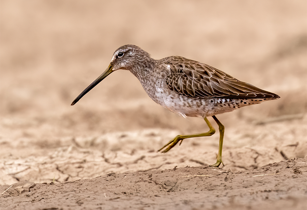 The Long-billed Dowitcher is a medium-sized shorebird, characterized by its stocky body, straw-yellow legs, and straight bill which it uses in a rapid “sewing-machine” probing motion to forage in shallow freshwater habitats.