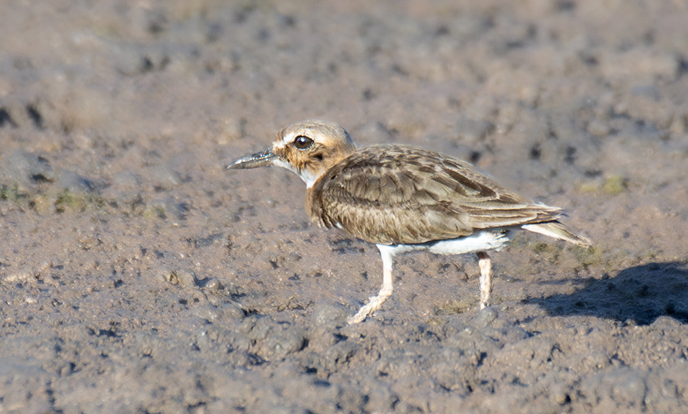 The Mountain Plover is a medium-sized ground plover measuring about 9 inches in length with a wingspan of roughly 23 inches, and weighing around 105 g (3.7 oz). Sexes are alike, displaying drably sandy-brown upperparts, bright white underparts, a thin black frontal band, and a prominent white supercilium. Compared with the more familiar Killdeer, it has longer legs and a more erect posture. This species favors level, dry habitats with very short vegetation or bare ground—often maintained by grazing livestock or agricultural activities—and forages by walking in loose flocks, picking off insects and other small arthropods.