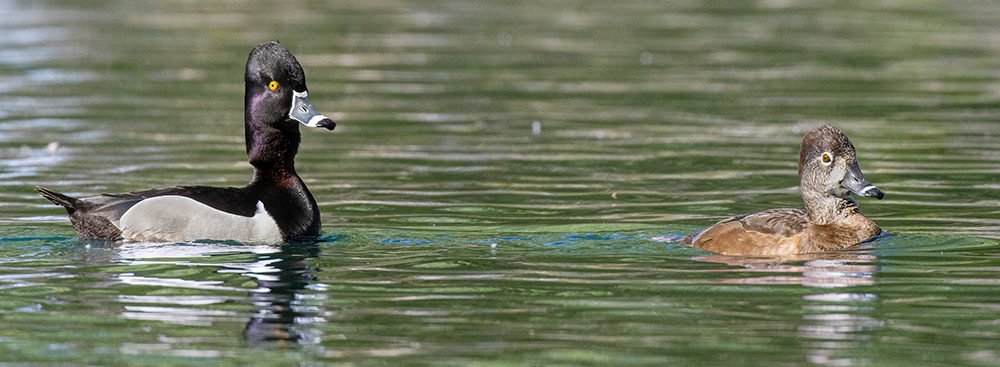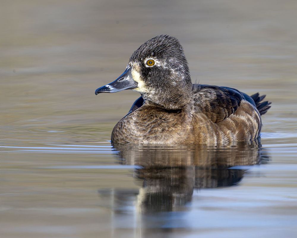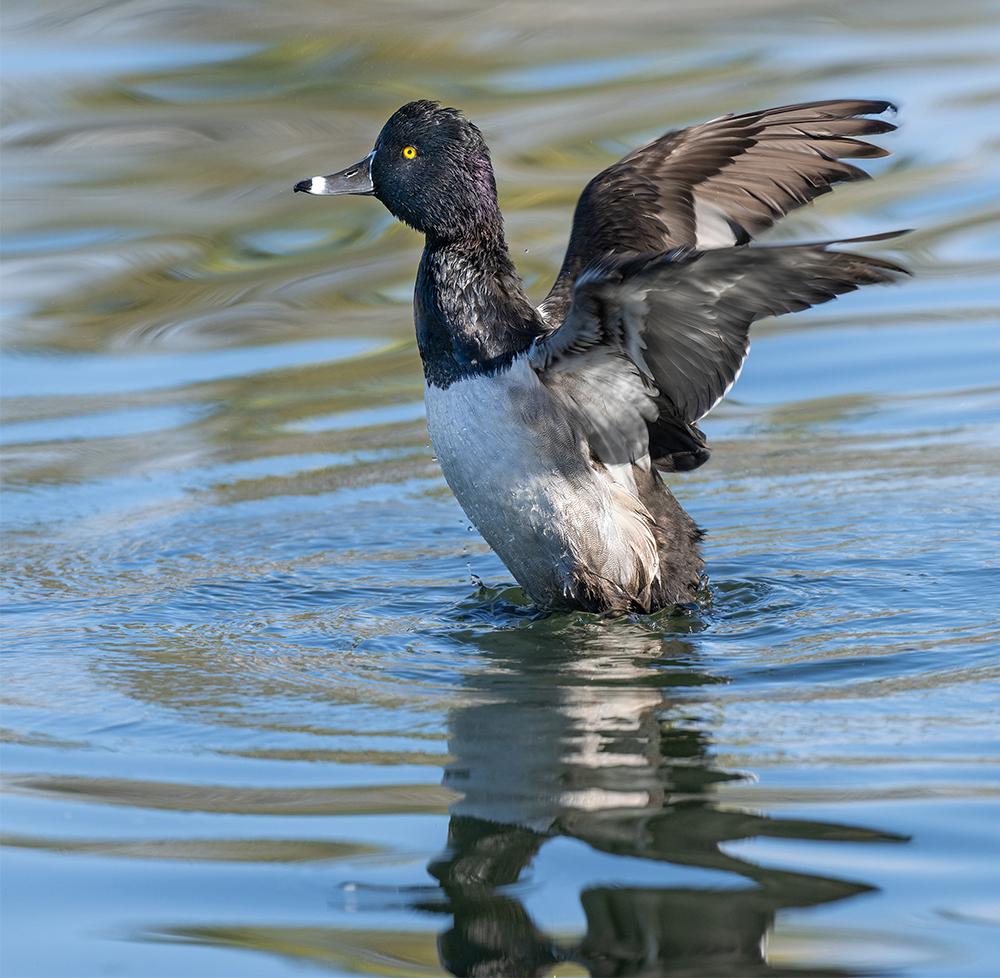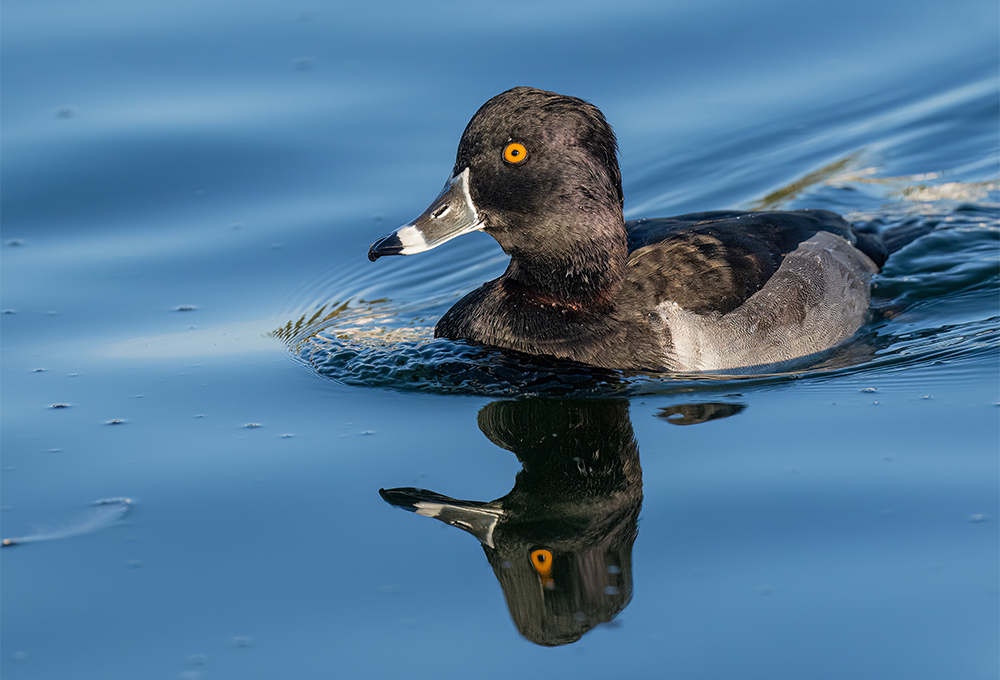 Ring-necked Ducks are regular winter visitors to Arizona’s lakes, marshes, and reservoirs, typically arriving in October and departing by late March or early April. Males are striking in flight and on the water, with glossy black heads, white eye rings, and distinctive rust-colored neck bands barely visible at close range; females are more subdued, with brown bodies, pale eye rings, and a faint neck ring. Both sexes dive for seeds, aquatic plants, and invertebrates, often congregating in mixed flocks with other diving ducks such as Lesser Scaup and Canvasbacks. They favor deeper, clear water but will use shallow margins during migration. Peak numbers in Arizona often exceed several thousand birds, especially on the lower Salt and Verde river reservoirs. Although they rarely attempt to breed in the state, occasional spring records hint at exploratory nesting efforts in secluded marshes.