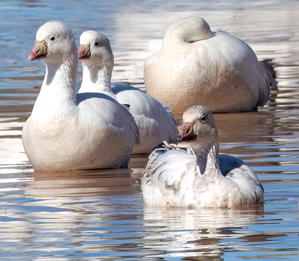 Compare the two Ross's Geese on the left with the Snow Goose in the foreground.