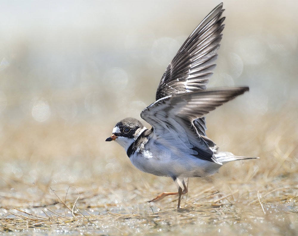 The Semipalmated Plover is a small, compact shorebird measuring 6.7–7.5 inches in length with a wingspan of 18.5–19.7 inches and weighing about 1.6–1.8 oz. Adults have a plump body, round head, short stubby bill, orange‐and‐black bill, orange legs, gray-brown upperparts, white underparts, and a single black breast band set against a white collar and face. They forage in a characteristic run-and-stop style on mudflats, sandbars, plowed fields, and shoreline margins, feeding by sight on insects, crustaceans, and worms.