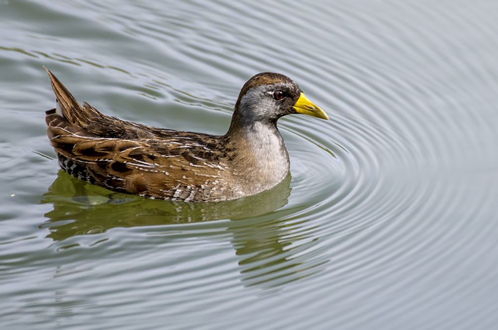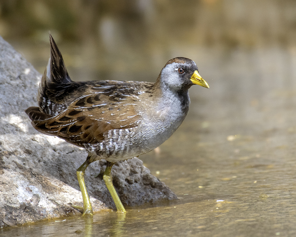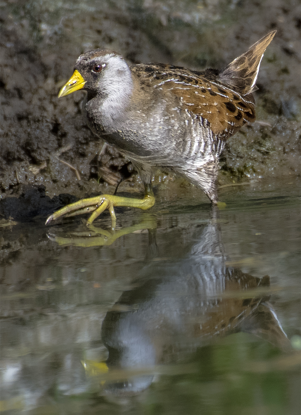 The Sora is a small, secretive marsh bird—about 7½–9 inches long—with olive-brown upperparts, gray face and breast, and finely barred flanks. In Arizona, Soras are most often encountered as spring migrants (late April through May) and fall migrants (September into early October), when they move through cattail and bulrush-dominated marshes and wet meadows in the Lower Colorado River Valley, along the Santa Cruz and Gila rivers, and at scattered high-elevation wetlands. A handful of winter records—especially in year-round marshes near Tucson and Yuma—attest to their occasional overwintering, but numbers remain very low. Because they are unusually shy, Soras are far more often heard than seen: their descending “whinny” and sharp, metallic “kek” calls at dawn and dusk give them away in the dense marsh vegetation. They feed by pecking and probing shallow water and soft mud for aquatic invertebrates, seeds and plant detritus. Although there are a few unconfirmed summer reports that hint at possible breeding, no nesting colonies have been reliably documented in Arizona.