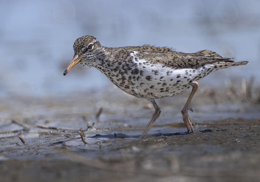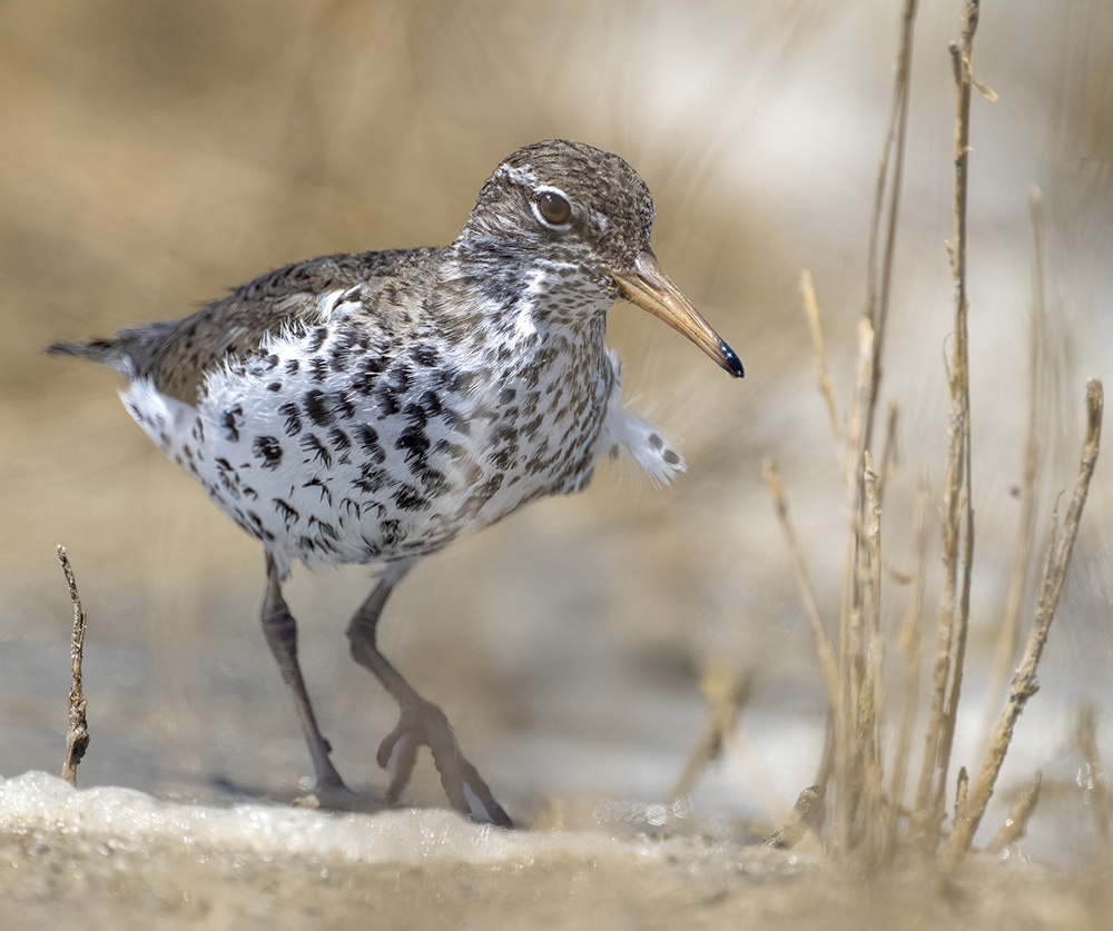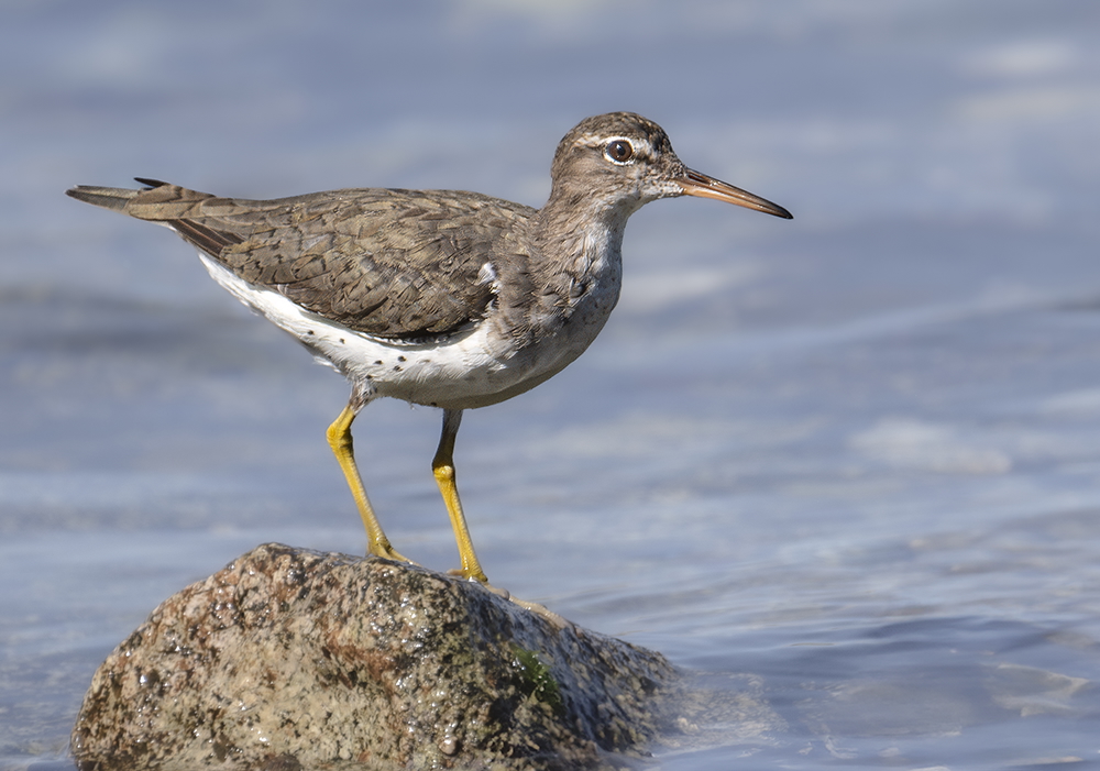 The Spotted Sandpiper is a slender shorebird (7.5–9.5 inches long; wingspan 14.5–15.8 inches) that, in Arizona, occurs as a spring and fall migrant and—at higher elevations—an uncommon summer breeder. You’ll most often find it bobbing its tail along the rocky margins of mountain streams in the Mogollon Rim and White Mountains from late April through July. During migration (late March–mid May; late July–early October), it spreads out across lowland rivers, marshes, irrigation canals and wetland edges statewide. Adults in breeding plumage show olive-brown upperparts, bright white underparts heavily spotted with dark teardrops, a clean white supercilium, and a straight bill about 0.8–1.1 inches long; non-breeding birds lack most spots. Spotted Sandpipers forage by sight—picking aquatic insects, crustaceans and small mollusks from mudflats and shallow water—and nest on the ground in a simple scrape lined with vegetation. Their constant teetering motion and spotted belly are unmistakable markers wherever they occur in Arizona.