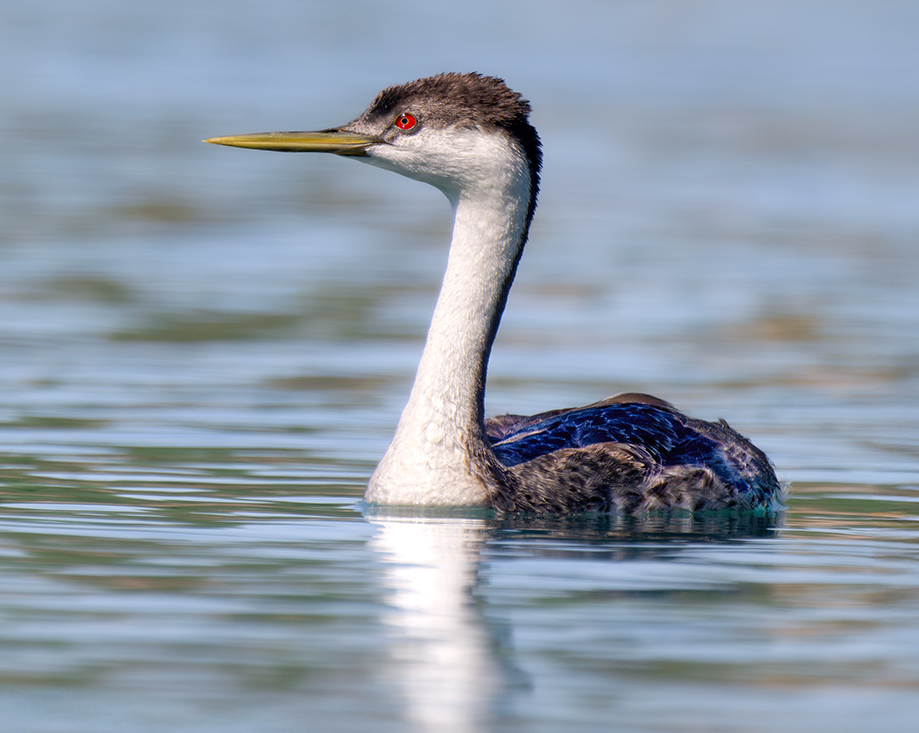 Western Grebe is the largest North American grebe, measuring 25 inches in length with a wingspan of 24 inches and weighing 1138–1826 g. Adults display striking black-and-white plumage with a sharply demarcated black cap, white cheeks, a slender swan-like neck, yellowish-green bill, and piercing red eyes.