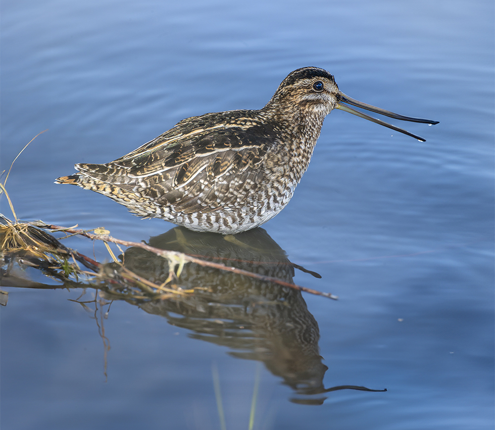 Wilson’s Snipe is a medium-sized, stocky shorebird measuring 9.1–11.0 inches in length with a wingspan of 15–18 inches, and weighing roughly 2.8–5.2 oz. In Arizona, it occurs primarily as a spring (March–April) and fall (September–December) migrant and occasional winter visitor, frequenting sedge-dominated marshes, wet meadows, flooded agricultural fields, and roadside ditches; birds are most active at dawn and dusk when they probe soft mud for insect larvae and earthworms with their long, flexible bills.